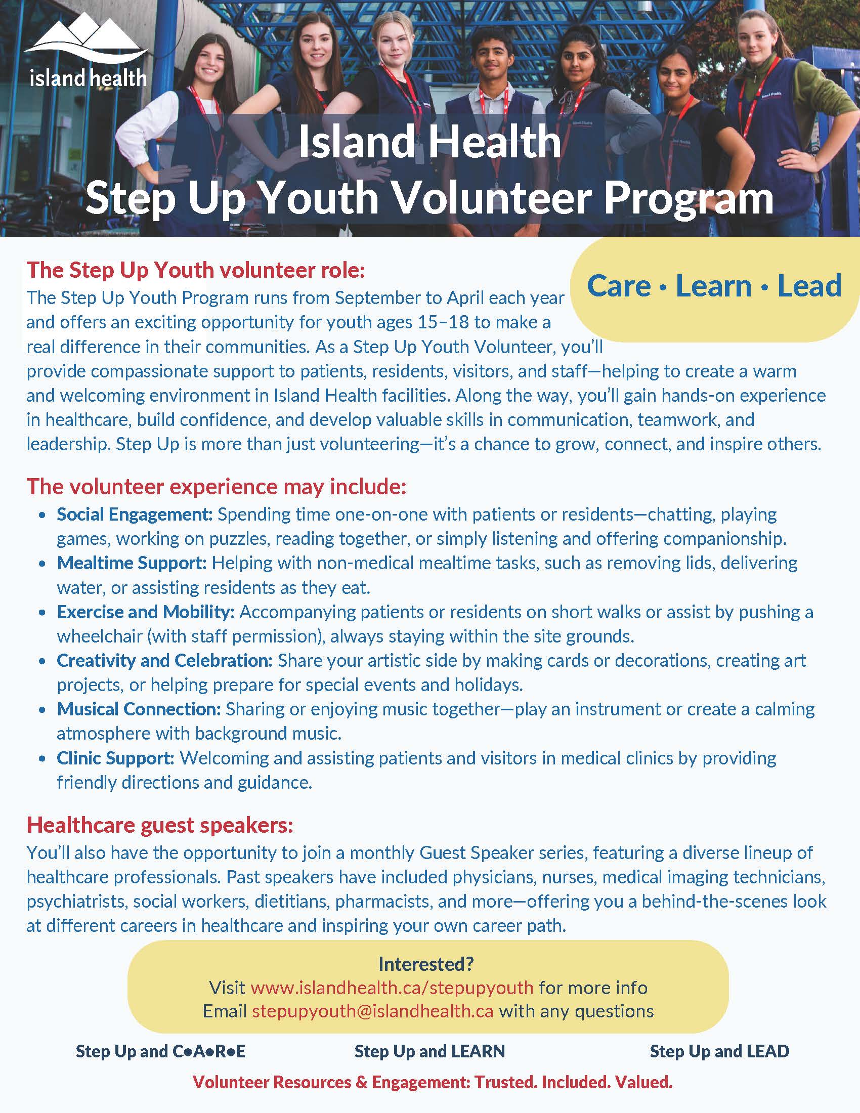 Step Up Youth Island Health Volunteer Program – Volunteer at a hospital! Ages 15-18. Application Open March 1 – May 15. 2026 SUYP Recruitment Poster