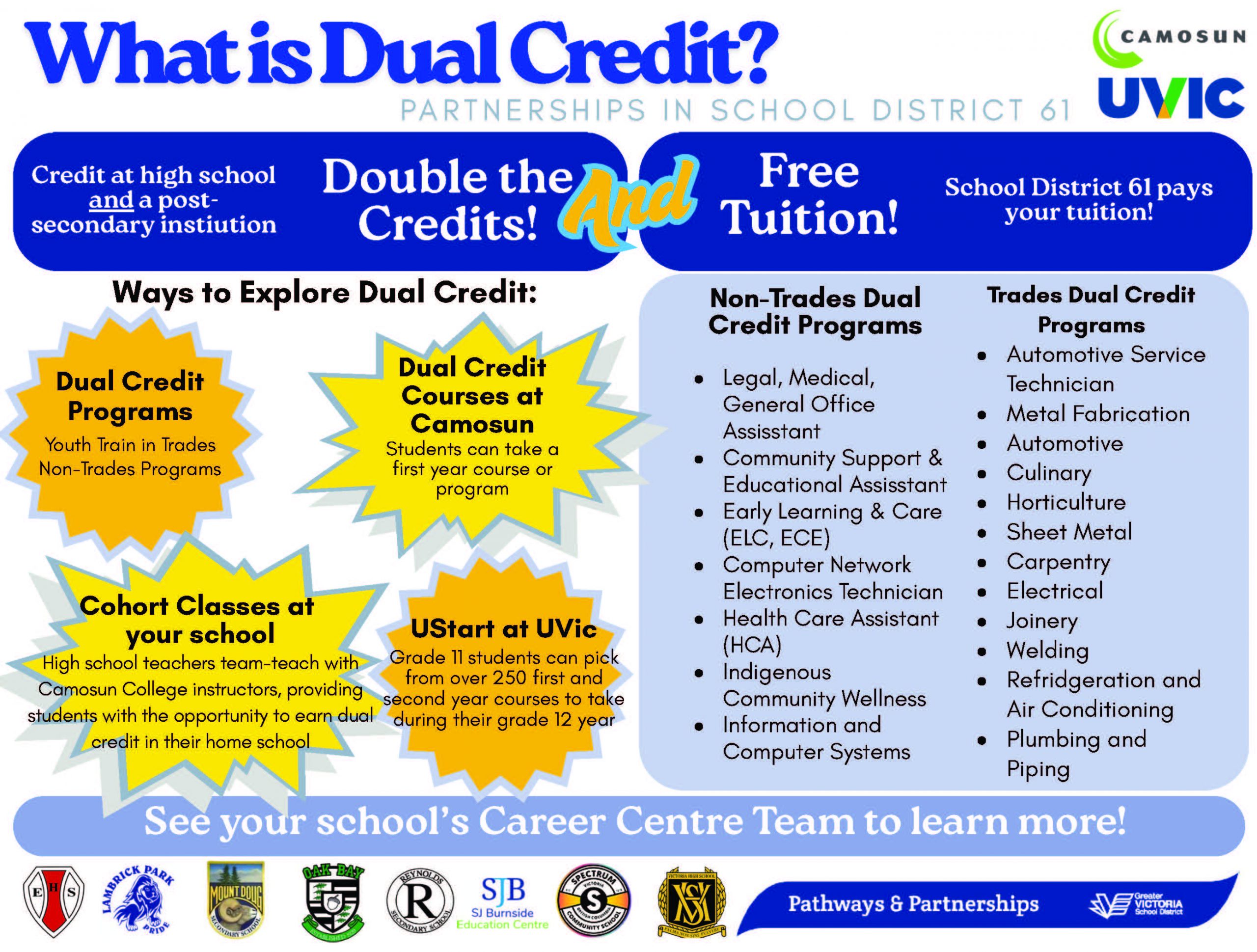 Dual credit courses and programs enable students to receive credit for post-secondary courses, while simultaneously receiving high school credit towards their graduation. Both Camosun College and University of Victoria provide SD61 students with the opportunity to take post-secondary courses, tuition-free, while they are still in high school.